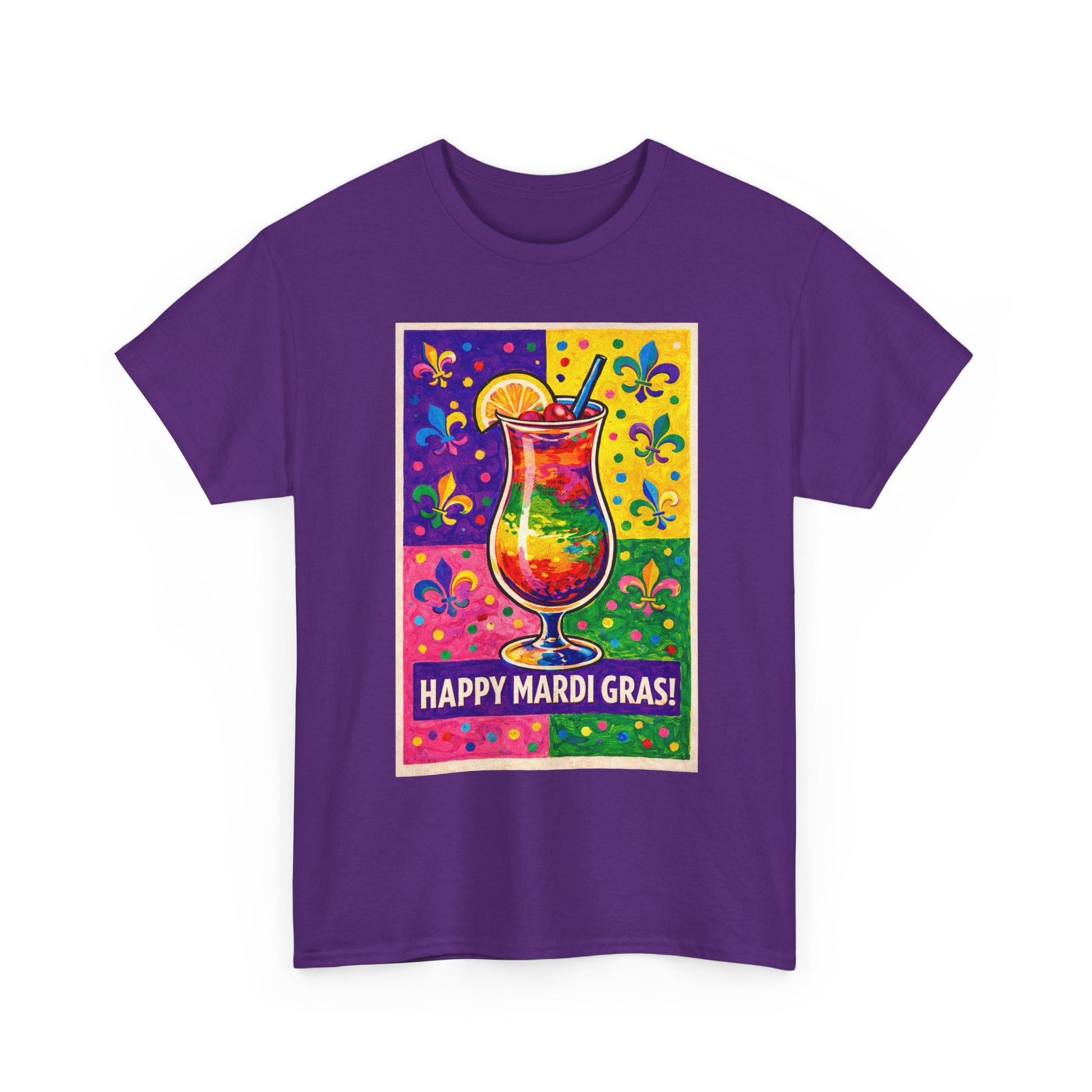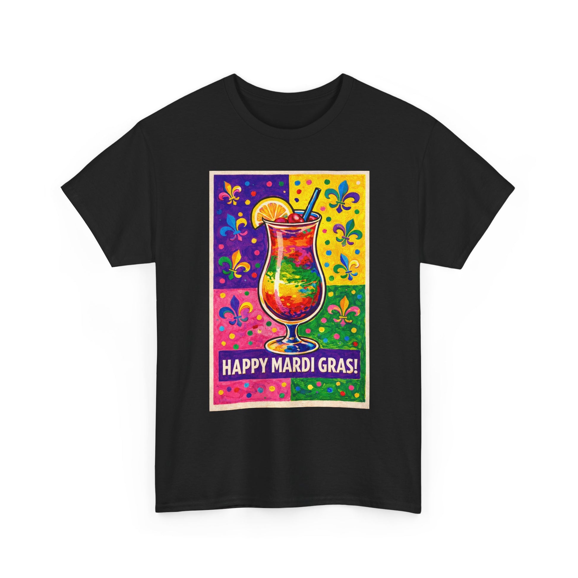 It's Mardi Gras! Wear your shirt and join the Party!! This classic tee carries the energy of Mardi Gras into everyday wear. The front-center print shows a delicious beverage in the middle of an Andy Warhol style background—colors that sing of parades, brass bands and late-night revelry. Soft, medium-weight cotton and a relaxed crew fit make it comfortable for long festival days or casual outings. Wear it to catch the next krewe, stroll through a music night, or bring a bit of festive grit to your regular rotation; the design sits bold and square on the chest, readable from across the street yet detailed up close.