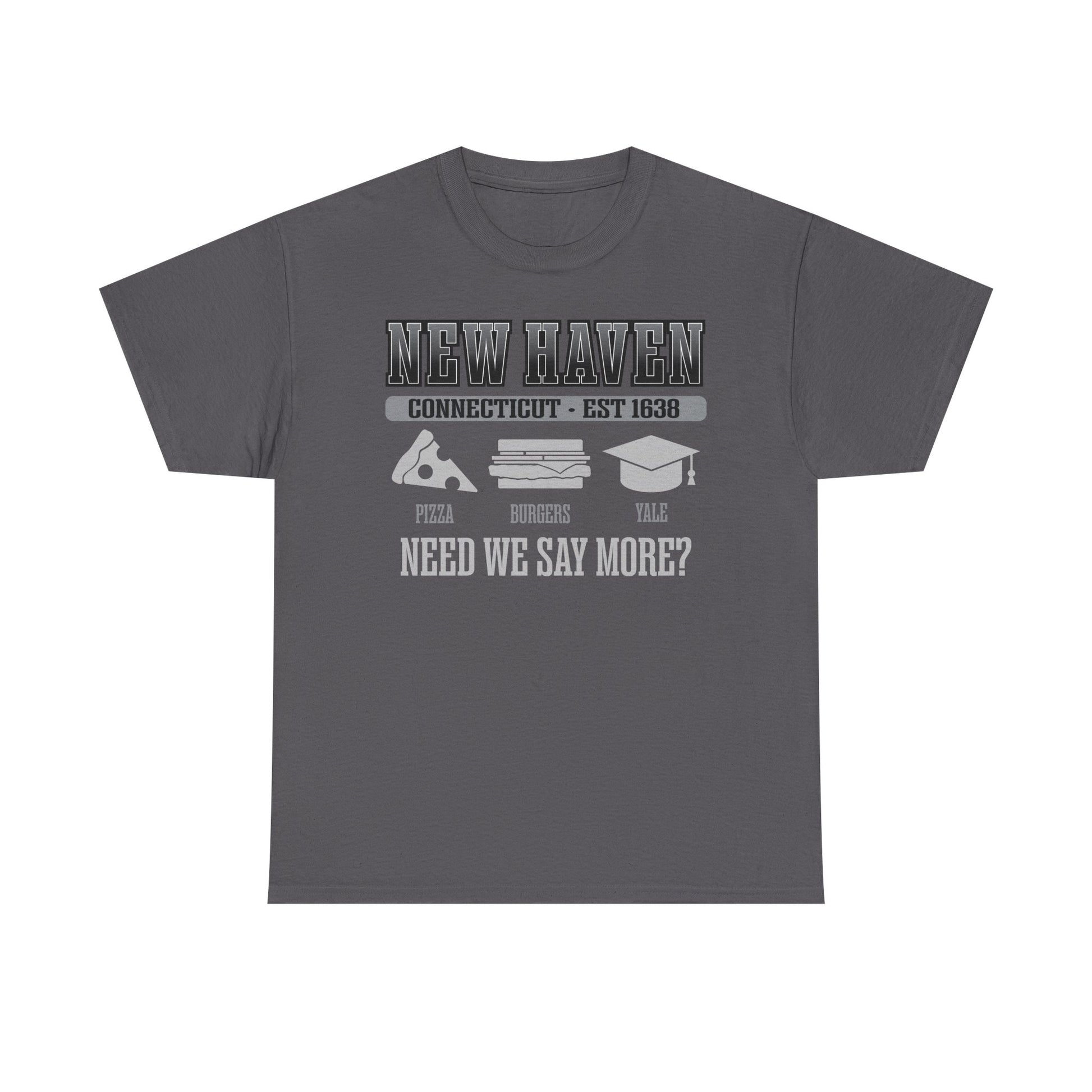 Celebrate the Pride of New Haven with this tee that shows off the Best New Haven has to Offer! Pizza, Burgers and Higher Education! This soft, classic-fit tee carries a little hometown pride with low-key humor. A bold “New Haven” header sits above slim icons — pizza (apizza), a burger, and a graduation cap — with the tagline “Need we say more?” It reads like a quiet nod to anyone who knows the city: late-night slices, campus energy, and local character. Wear it to stroll Chapel Street, grab a slice from Pepe's, or a Louis Lunch Burger after class, or just when you want to represent New Haven without shouting. The medium-weight 100% cotton fabric gives a smooth print surface and a comfortable everyday drape that layers easily under jackets or stands alone on warm days. Thoughtful construction — shoulder tape, ribbed collar, and a tubular knit body — keeps the tee holding its shape wash after wash.