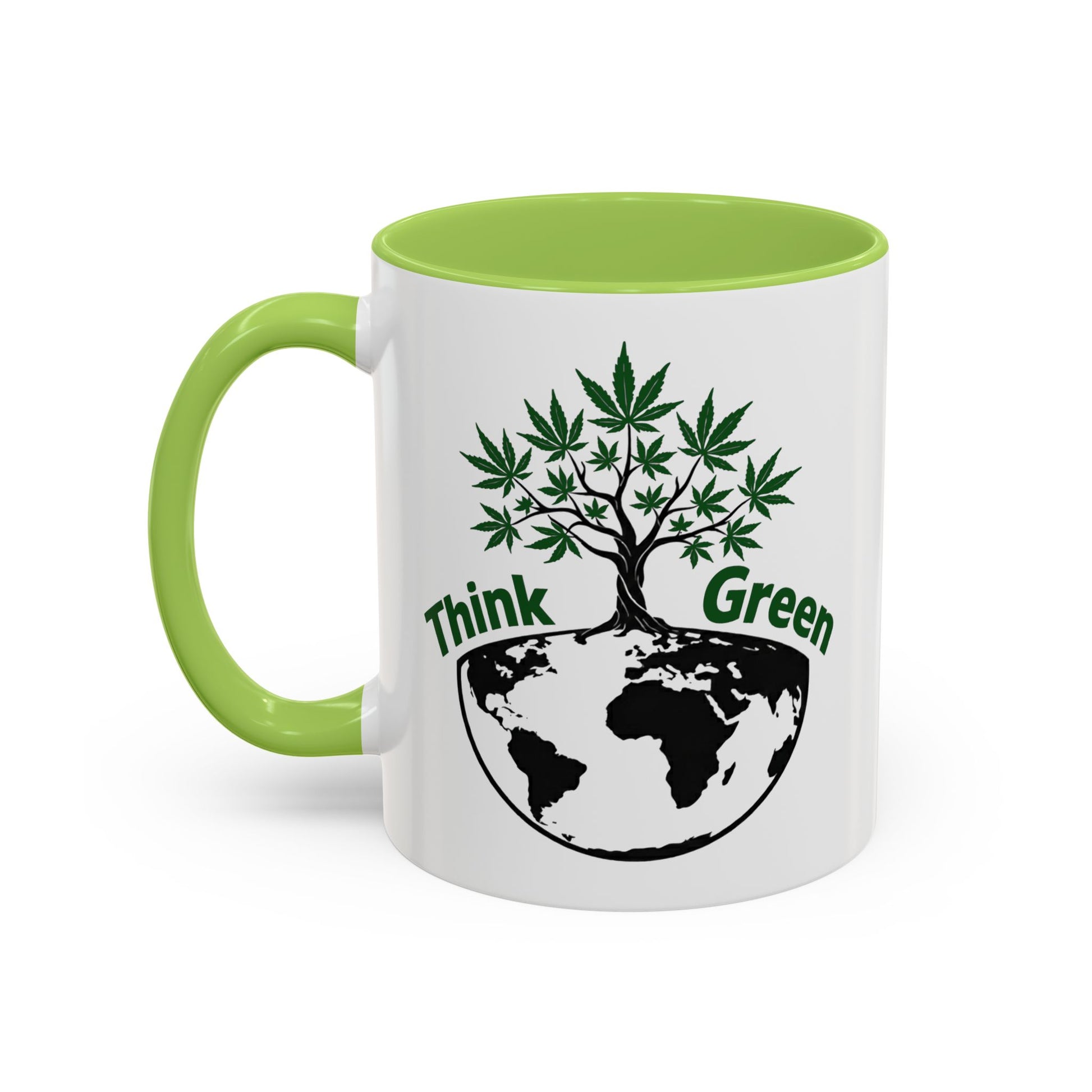 A warm, thoughtful mug that speaks to anyone who cares for the green goodness that comes from Mother Earth. Crisp green artwork wraps the white ceramic body: a stylized globe cradling a tree whose leaves echo cannabis-shaped foliage, framed by the words “Think Green.” The colored interior and handle add a friendly pop that makes morning coffee or late-night tea feel like a small act of conscious living. It’s sturdy, glossy, and easy to use — bright colors that hold up over time and cleaning. Imagine settling into your kitchen table with this mug in hand, feeling connected to a community that values greener choices and subtle, unapologetic self-expression.