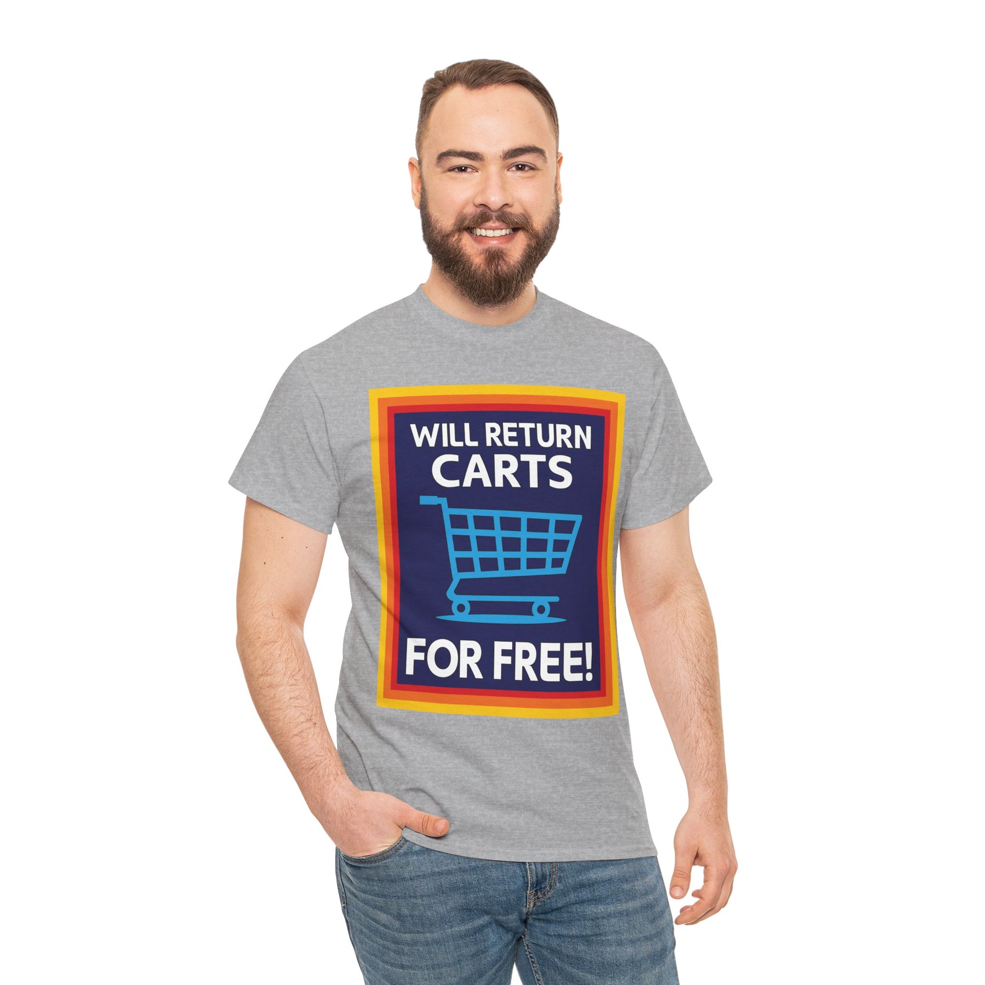 Wear this shirt to your favorite discount Grocery Store and see what happens! Pull a little side-hustle while you shop! Bold wordong proclaims "WILL RETURN CARTS FOR FREE" with a generic shopping cart image. Help out and keep your parking lots clean and hazard free while helping pay for your rock-bottom price groceries!